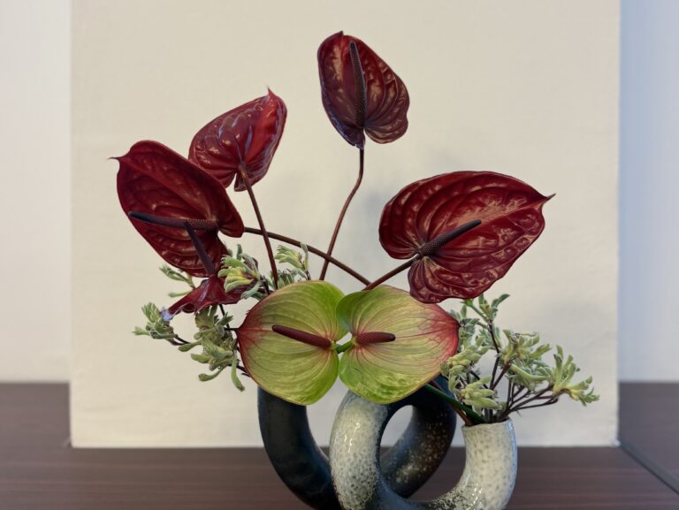 アンドレア・ジョルジェスク(Andreea Georgescu)氏を中心に、草月流のいけばなワークショップを開催しました。アンドレア氏は、草月流認定講師であり、ルーマニア国内で多数の展覧会や講座も開催されています。ルーマニア・アメリカ大学内でも、いけばな草月流の実践講座が実施され、多くのルーマニア人学生がいけばなを学んでいると言います。今回は、参加学生向けに「いけばな体験ワークショップ」を開催していただきました。今回が初めての挑戦という学生達に向けて、「真(しん)・副(そえ)・控(ひかえ)」などの立体的な美しさを生み出す表現方法について英語で詳しく解説していただきました。